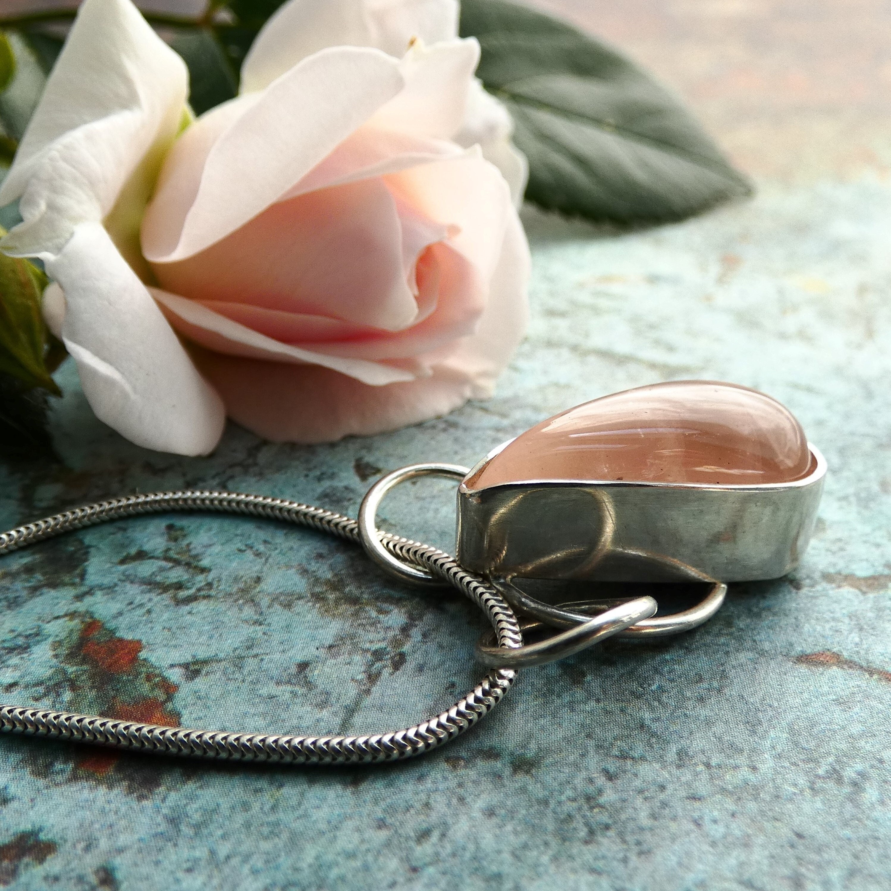 This beautiful pale pink Rose Quartz natural gemstone is set in a classic bezel setting in sterling silver. It is a handmade, one of a kind item.