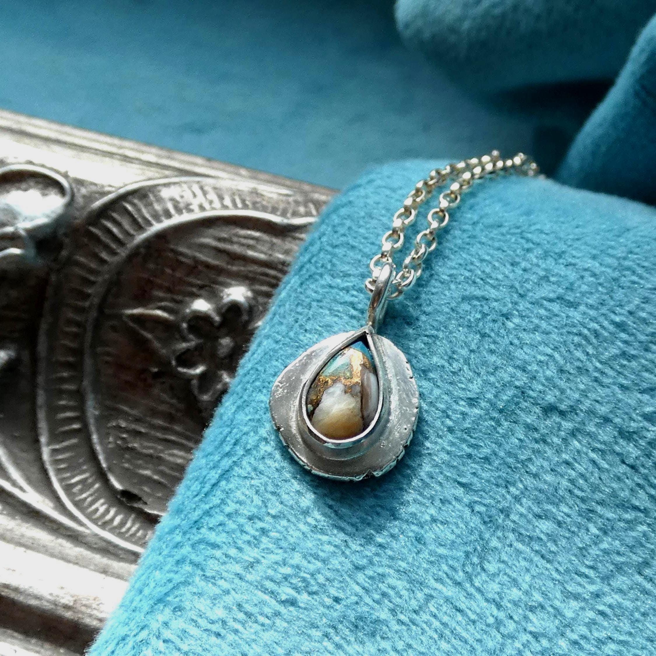 This teeny tiny, dainty pendant is handcrafted from sterling silver with a multi coloured teardrop shaped Oyster Turquoise natural gemstone set in a classic bezel setting. This rustic, one of a kind pendant looks lovely on its own or part of a set of layering necklaces.