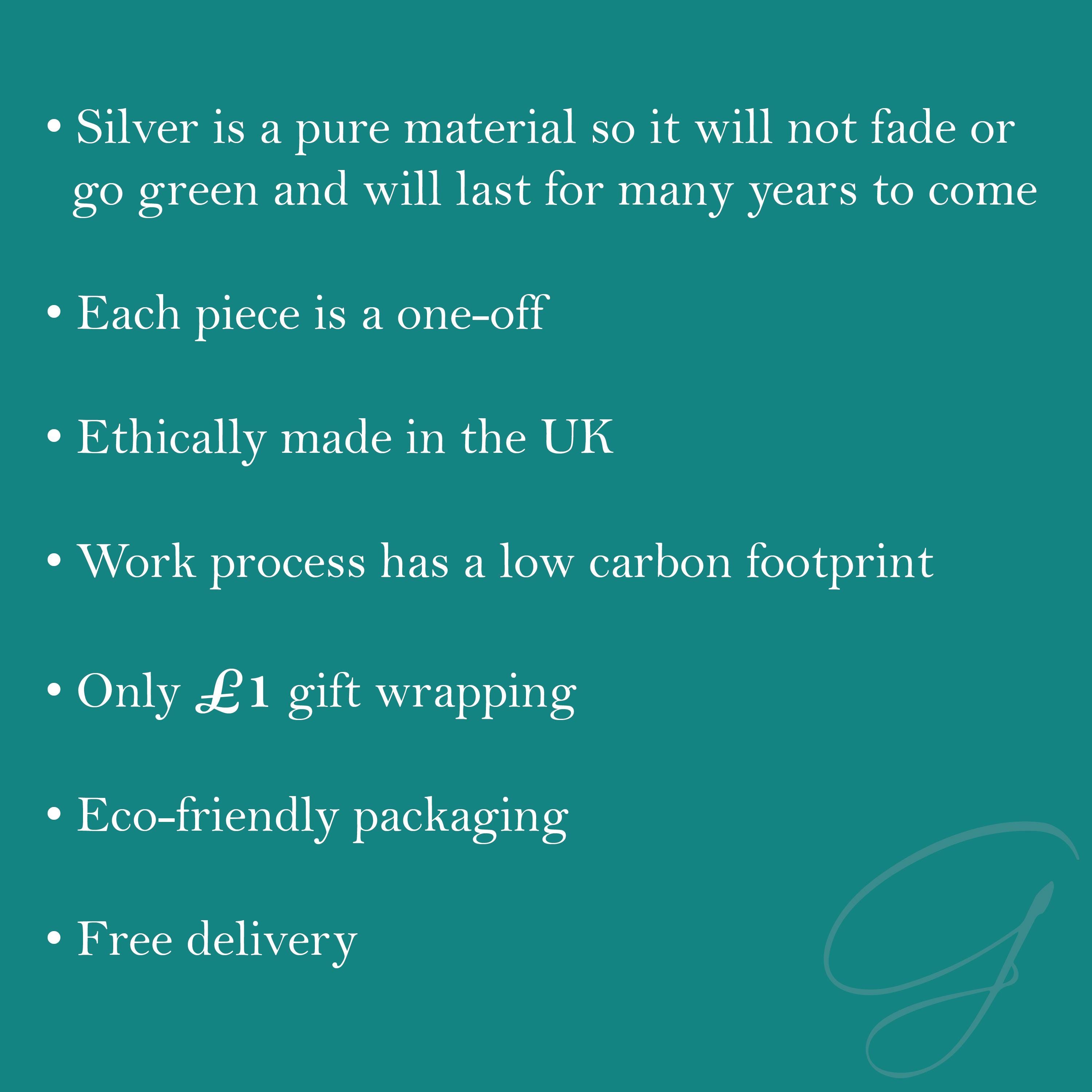 I use 100% recycled silver which is equal in quality to unrecycled, however this is a more ethical option.