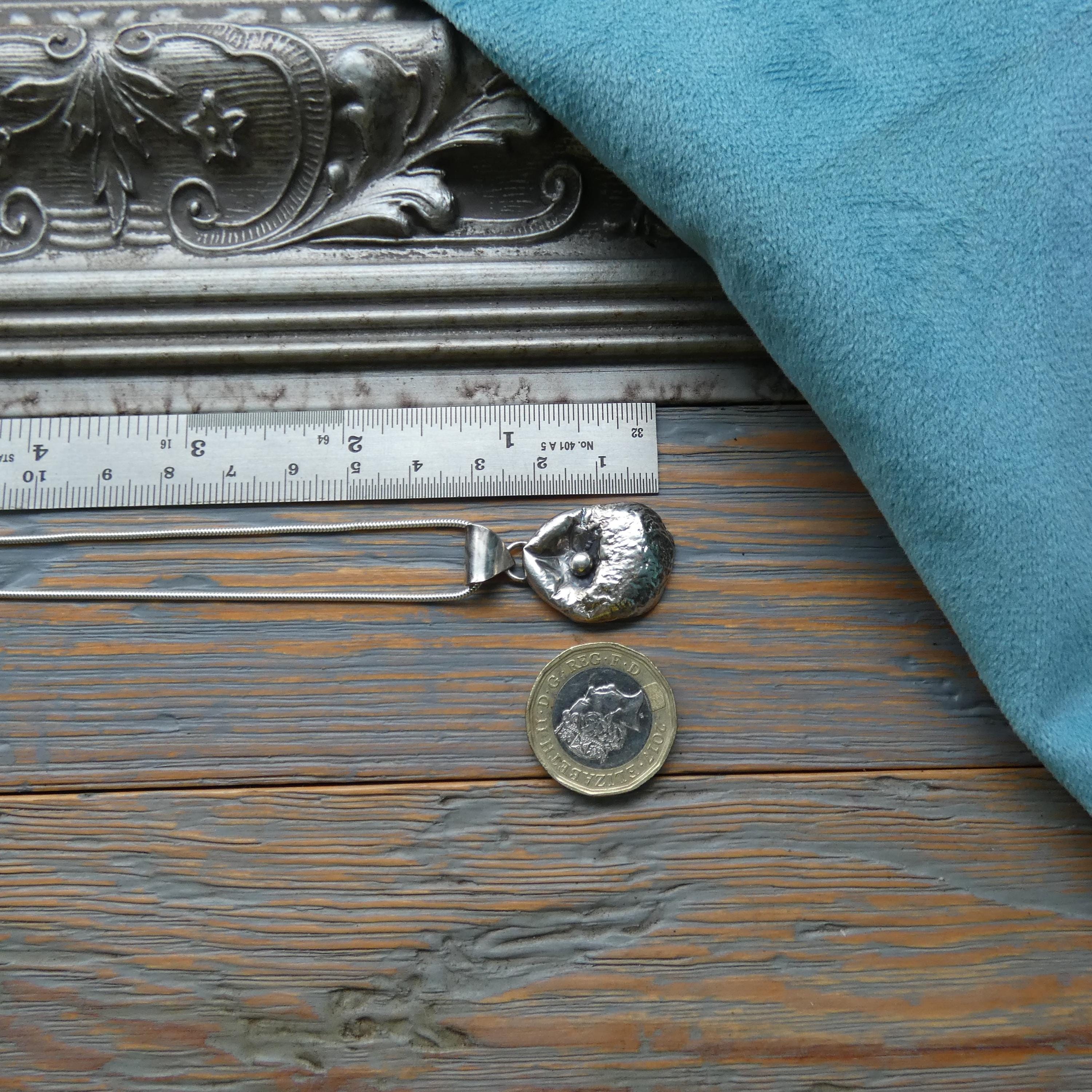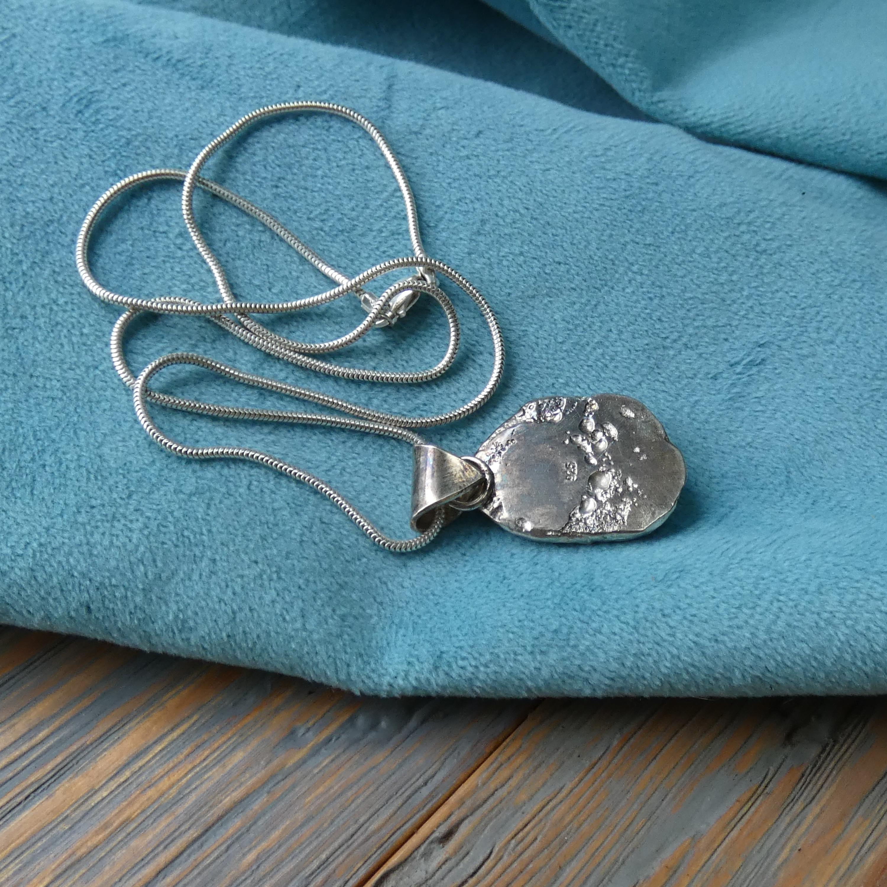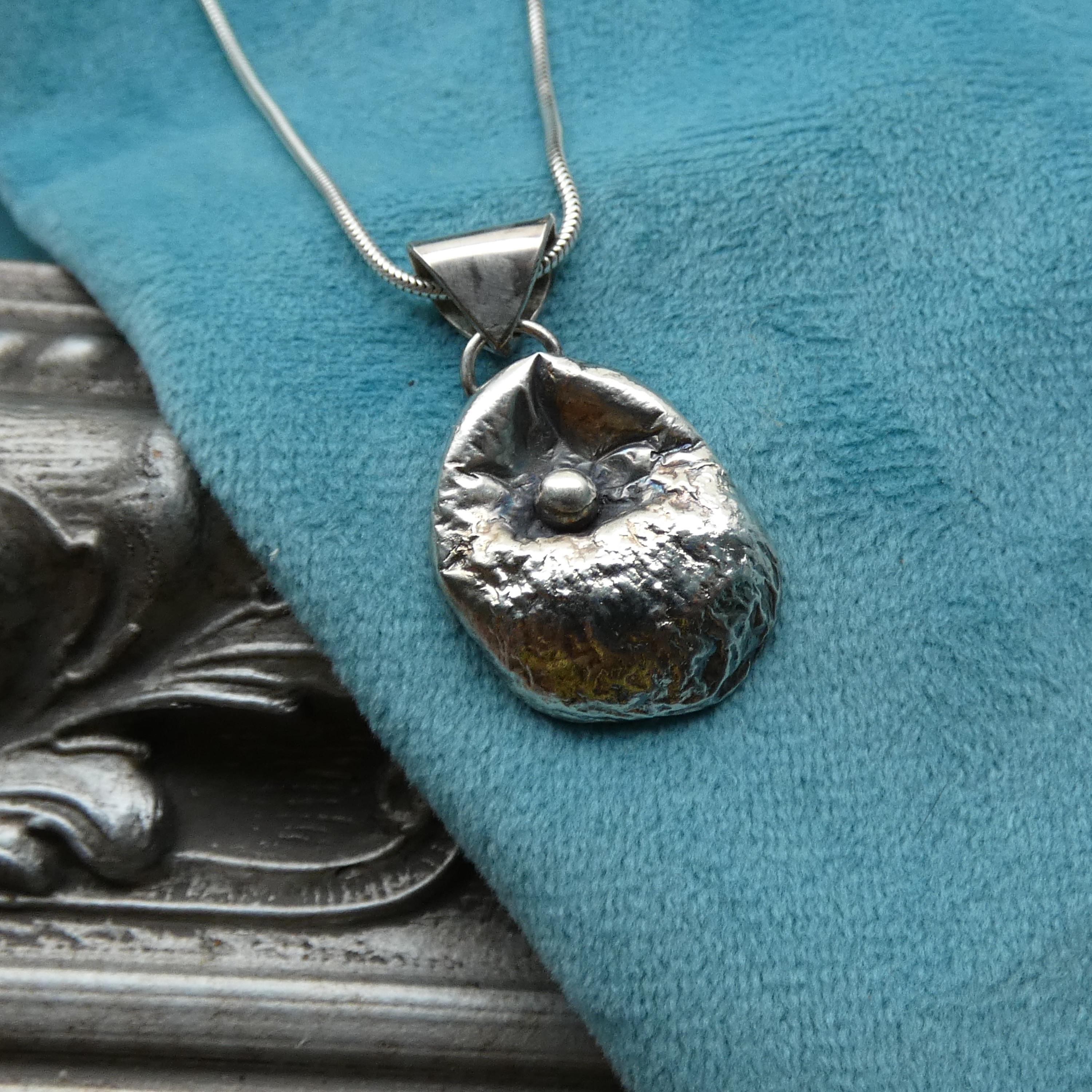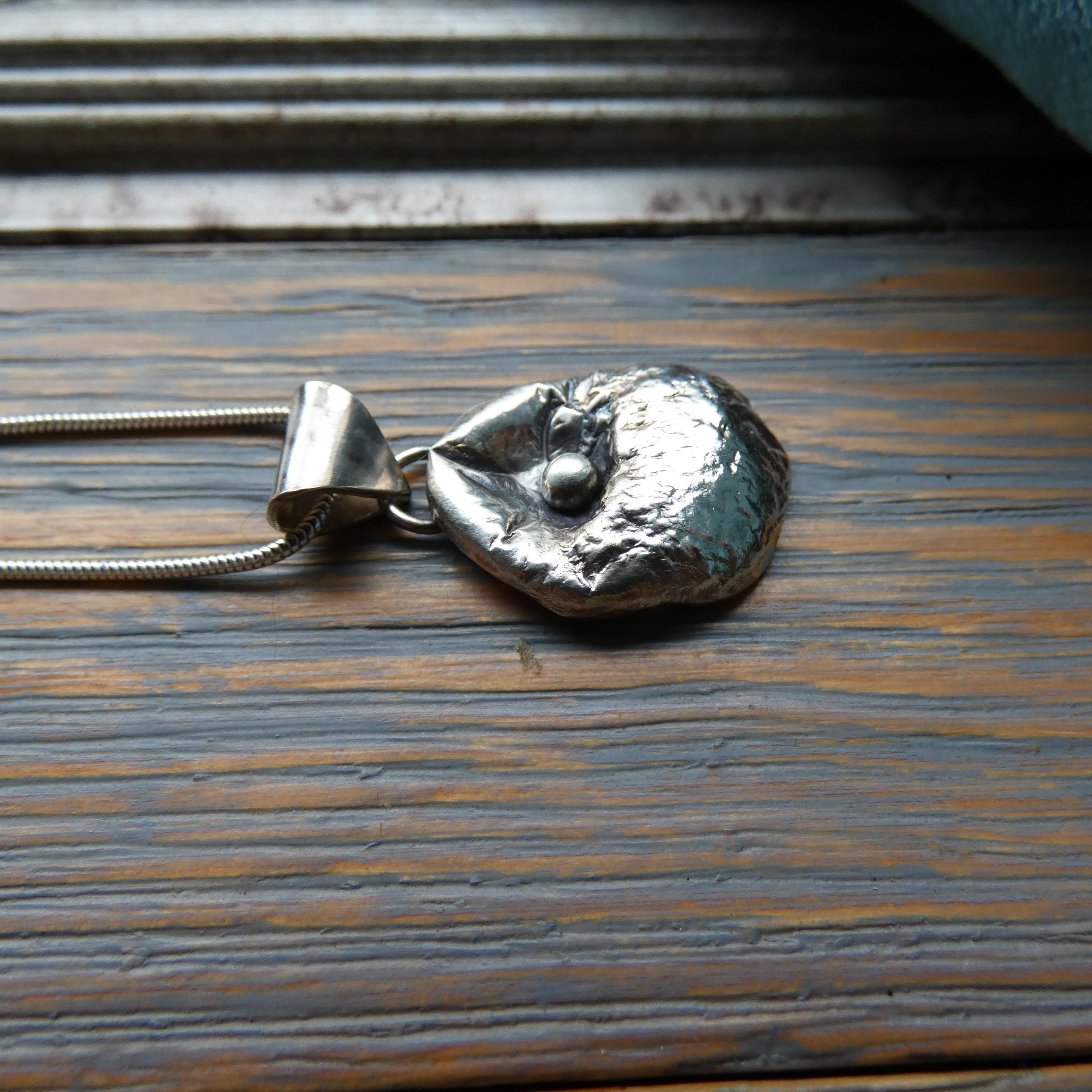 This 12 grams chunky, solid silver, freeform pendant is a one of a kind and handcrafted from molten silver. It features a small silver ball in the middle as it was dropped on its surface creating small, soft folds and wrinkles. It is slightly tarnished to enhance its heavy textured surface.
