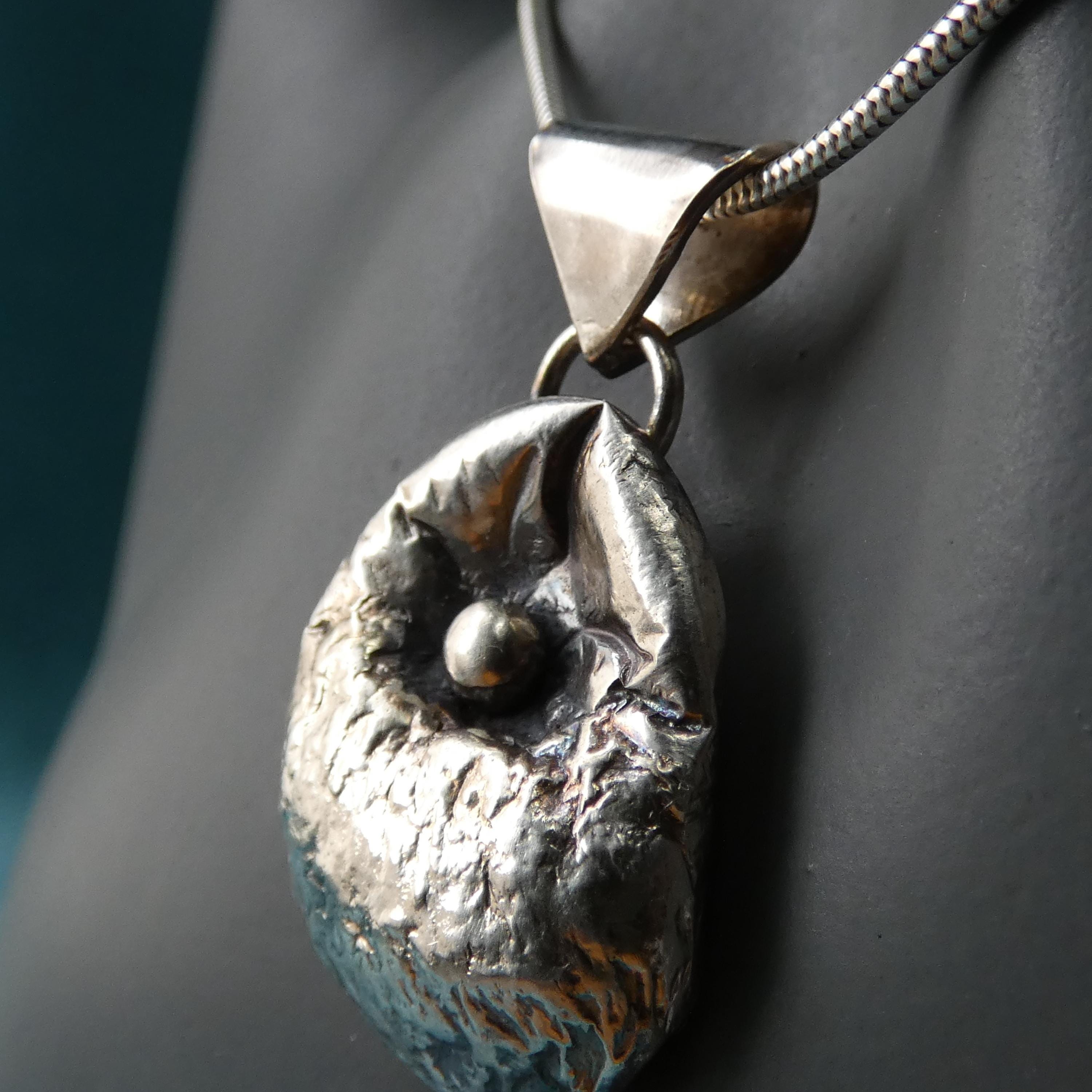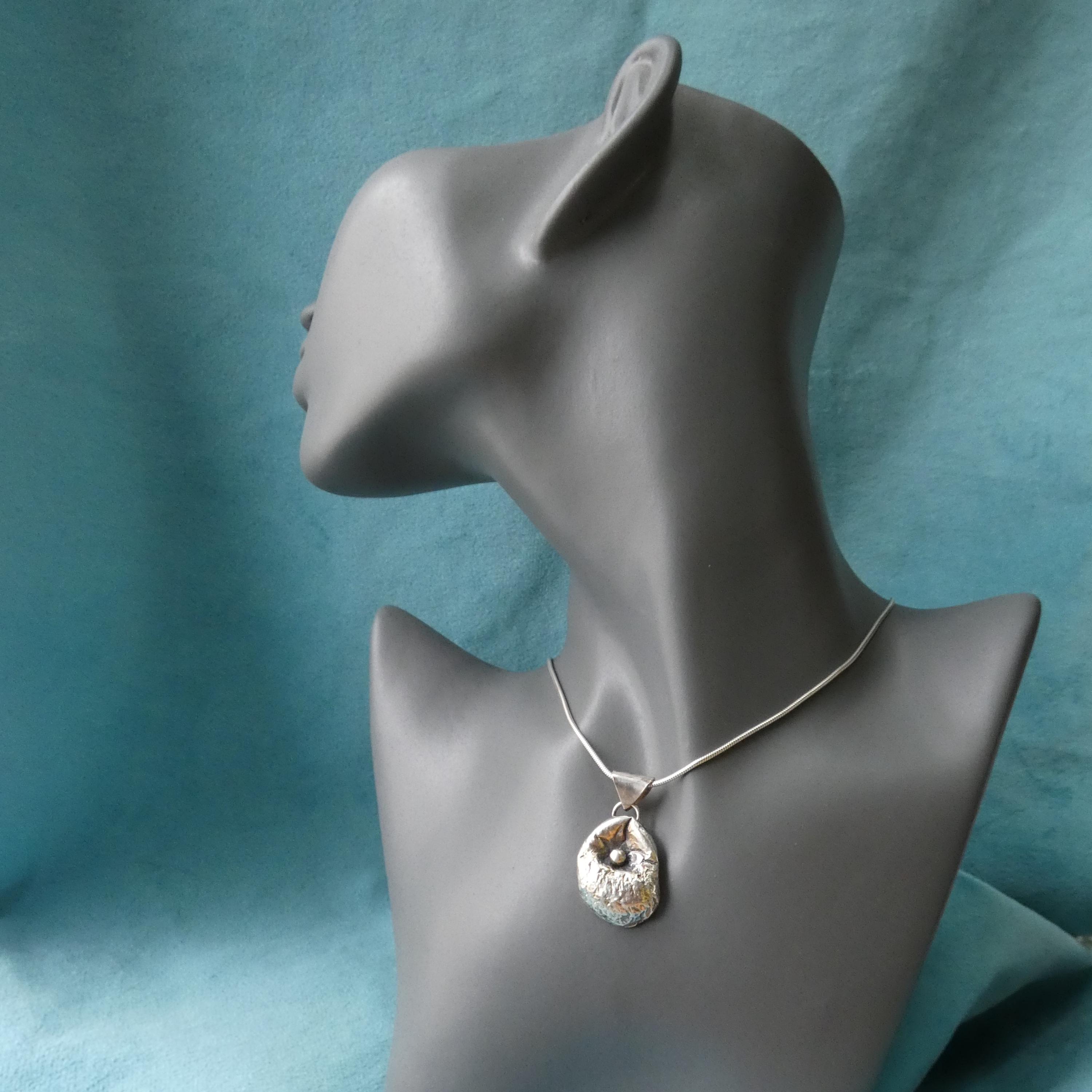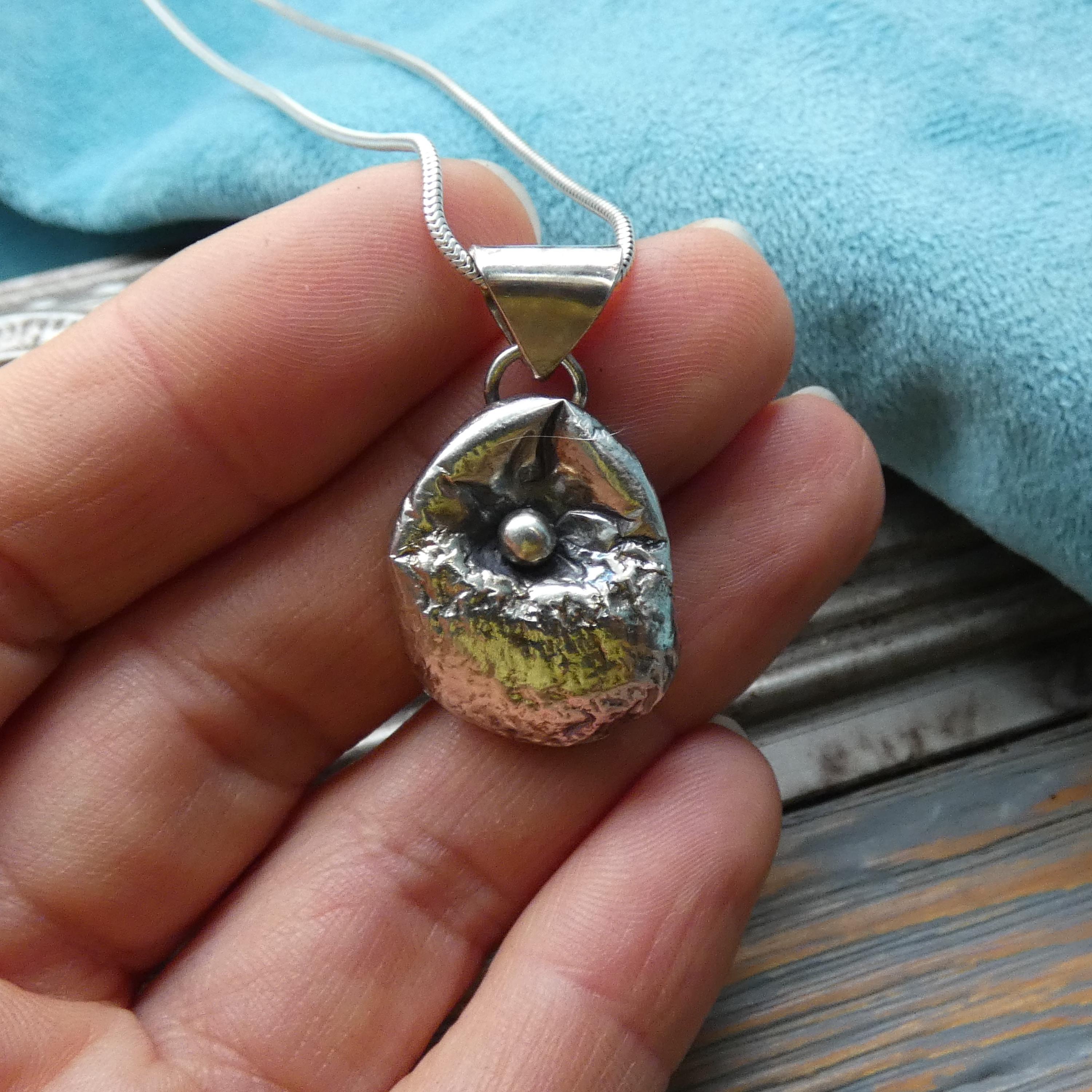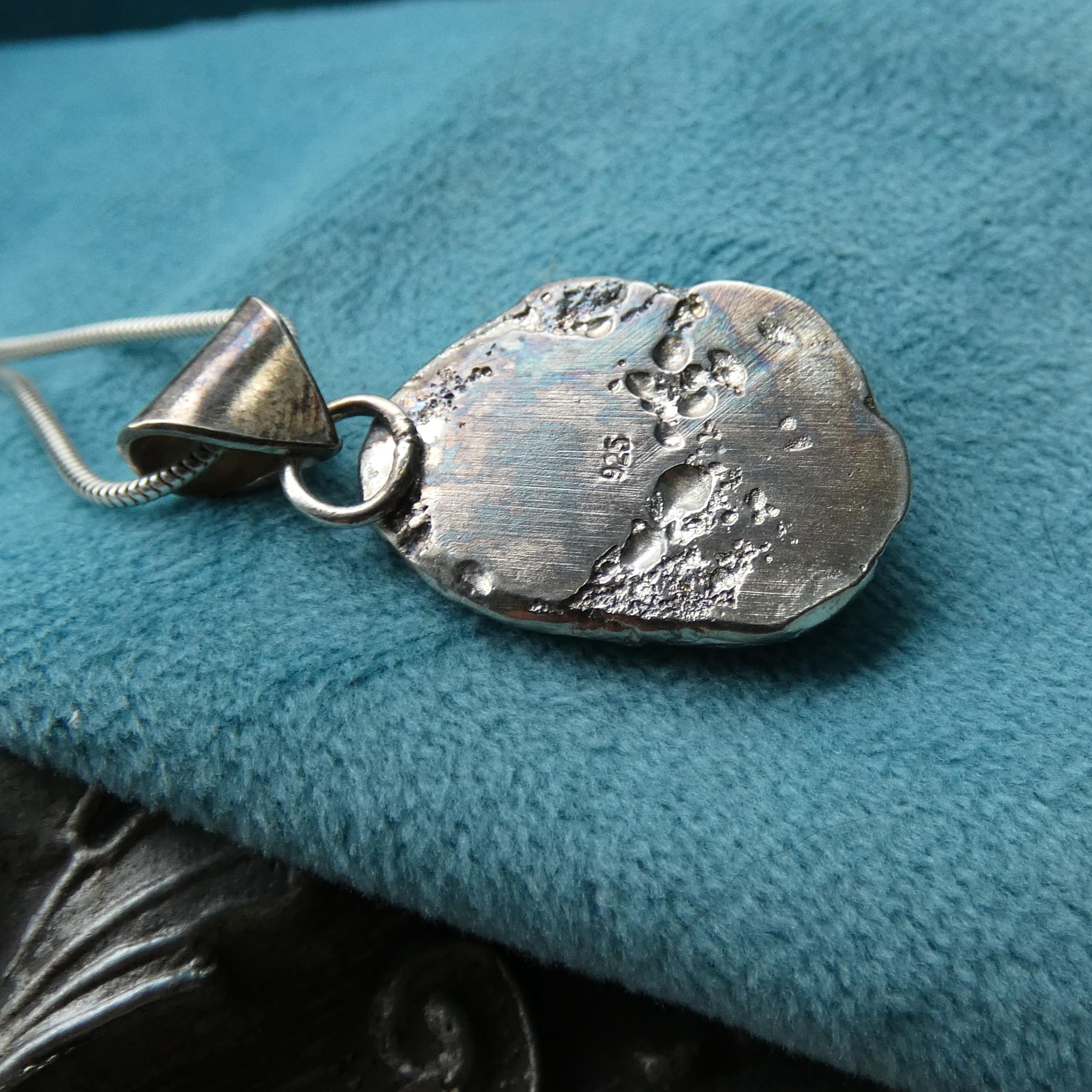 This 12 grams chunky, solid silver, freeform pendant is a one of a kind and handcrafted from molten silver. It features a small silver ball in the middle as it was dropped on its surface creating small, soft folds and wrinkles. It is slightly tarnished to enhance its heavy textured surface.