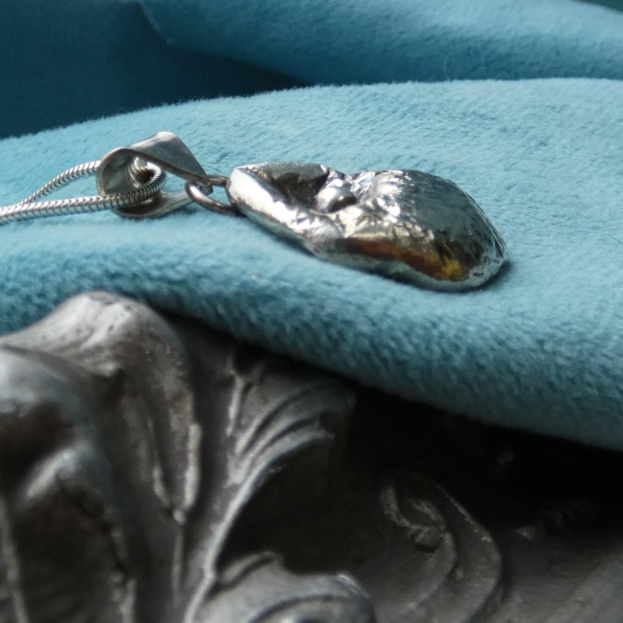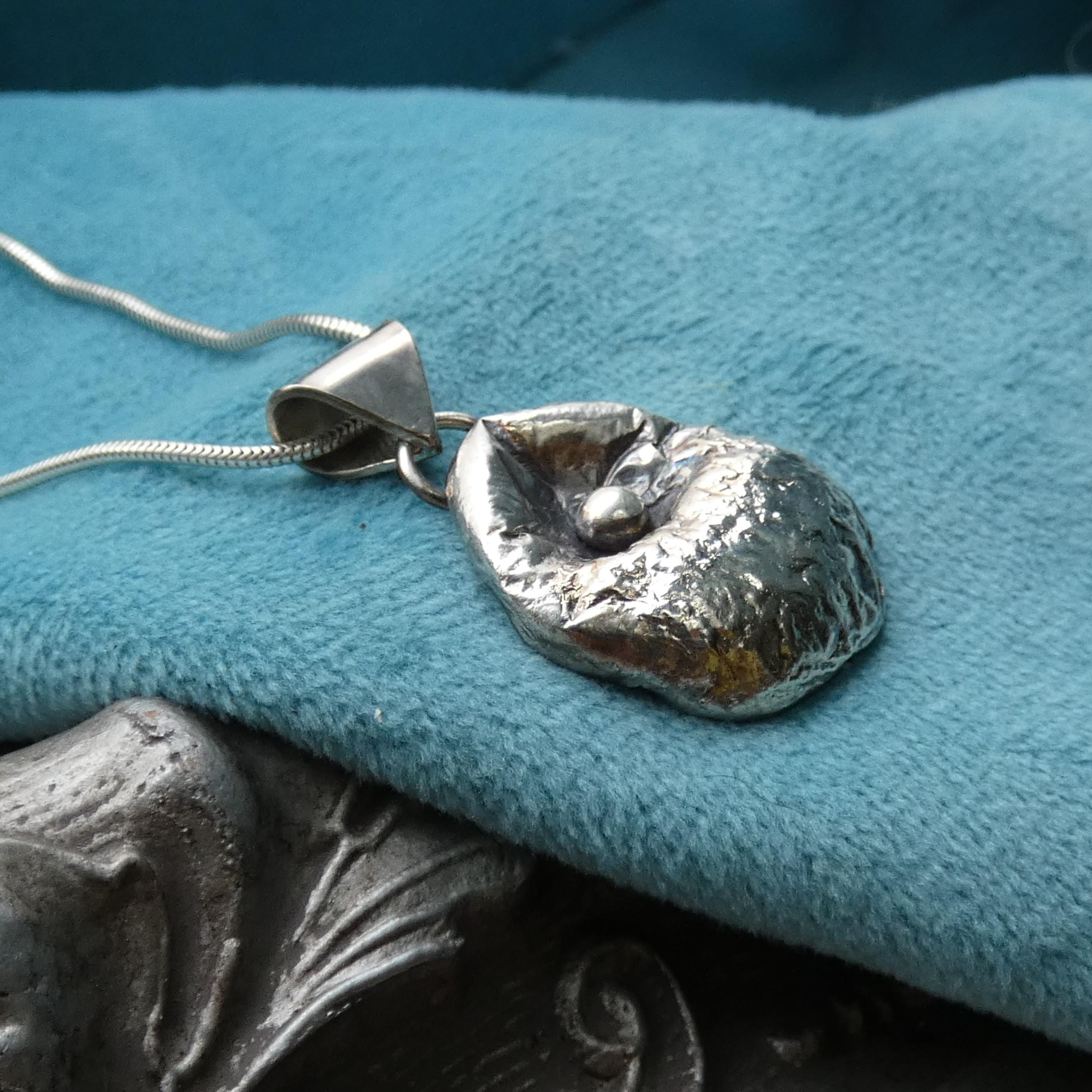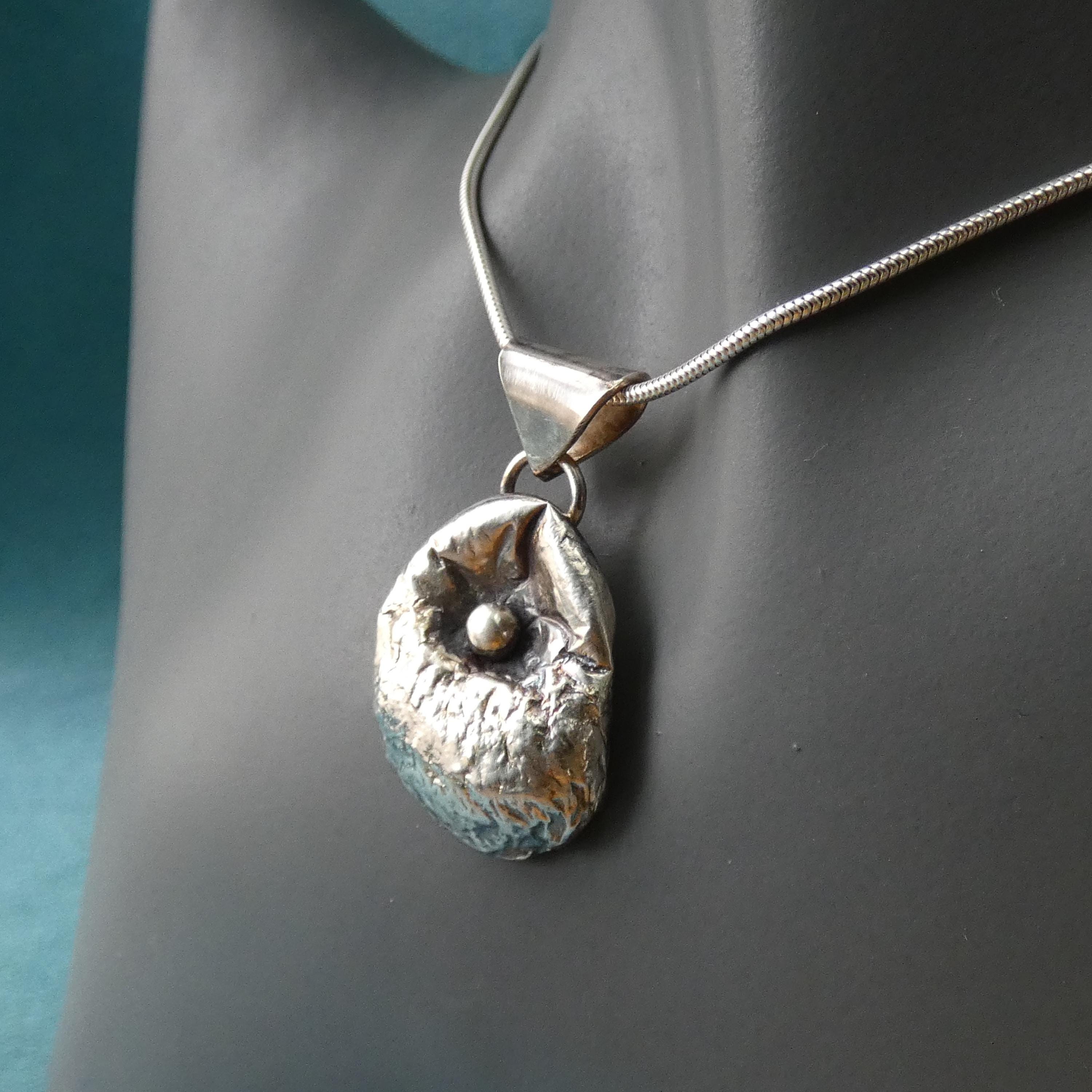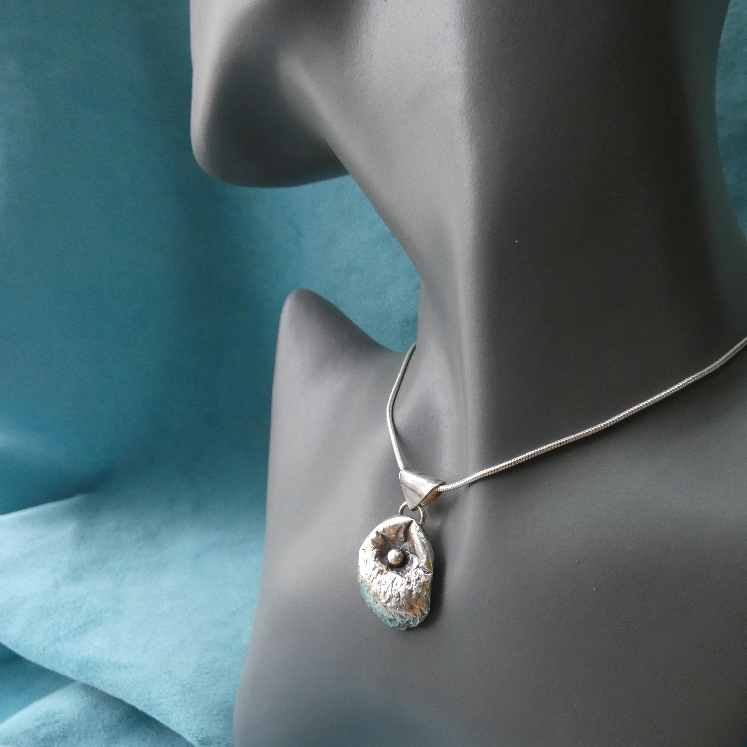 This 12 grams chunky, solid silver, freeform pendant is a one of a kind and handcrafted from molten silver. It features a small silver ball in the middle as it was dropped on its surface creating small, soft folds and wrinkles. It is slightly tarnished to enhance its heavy textured surface.