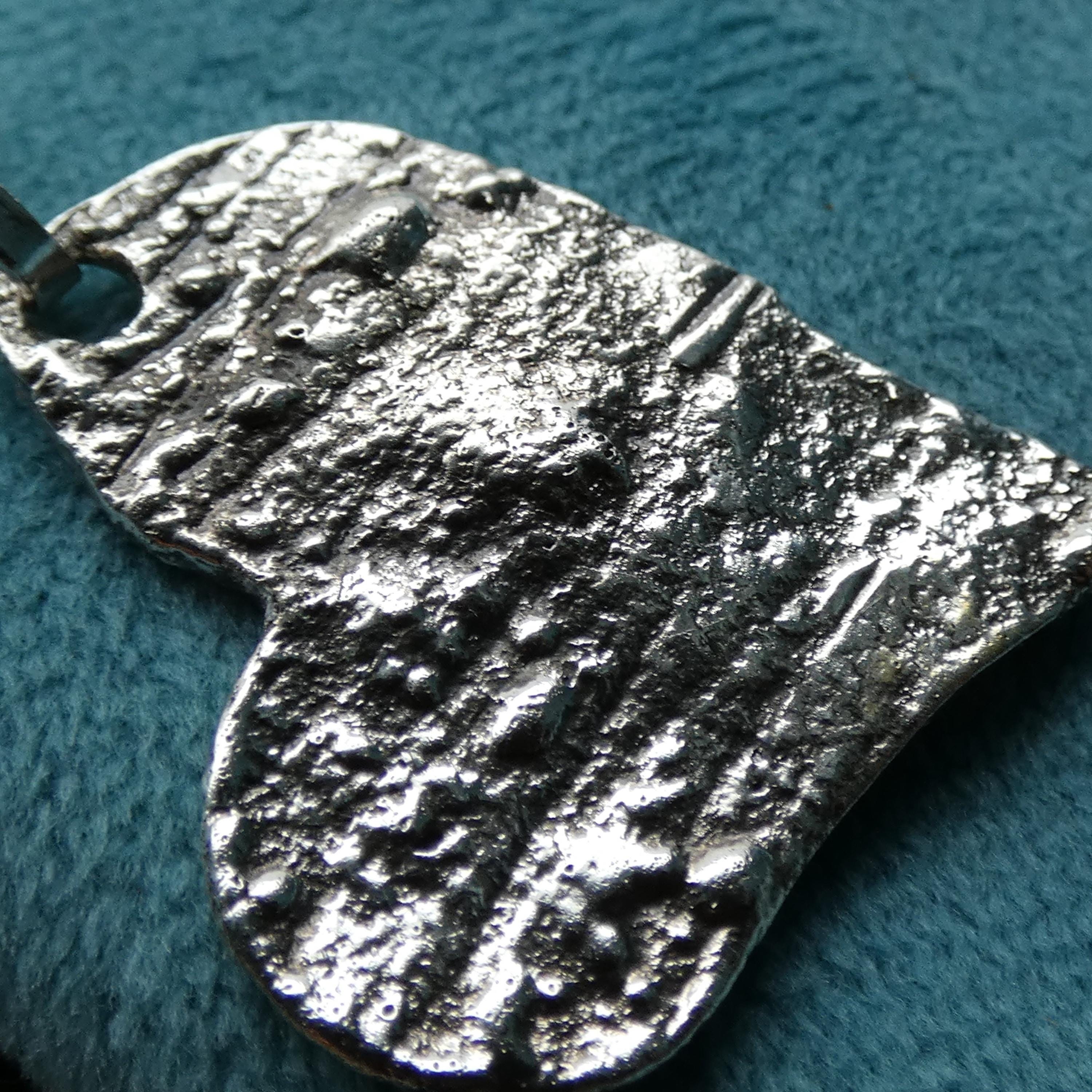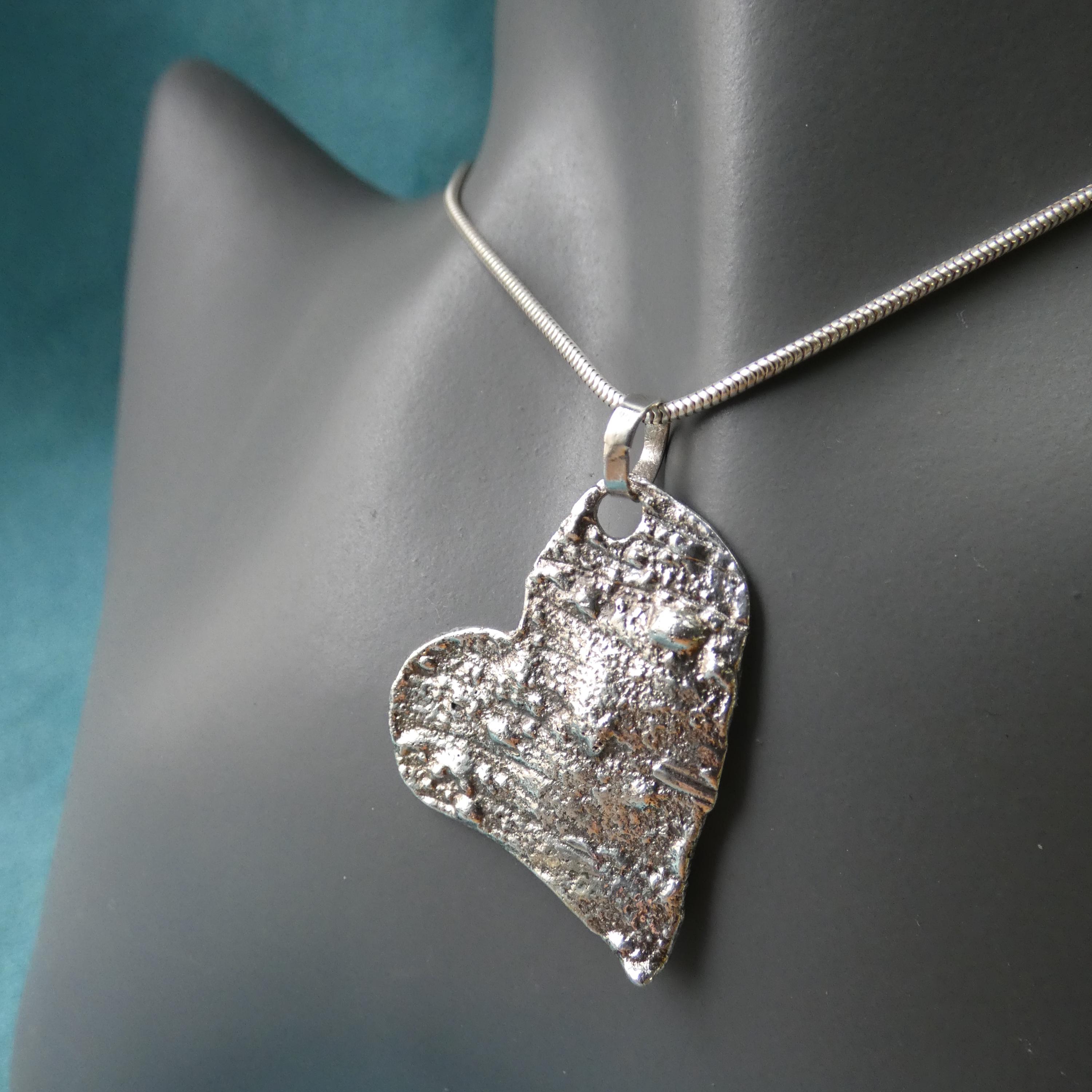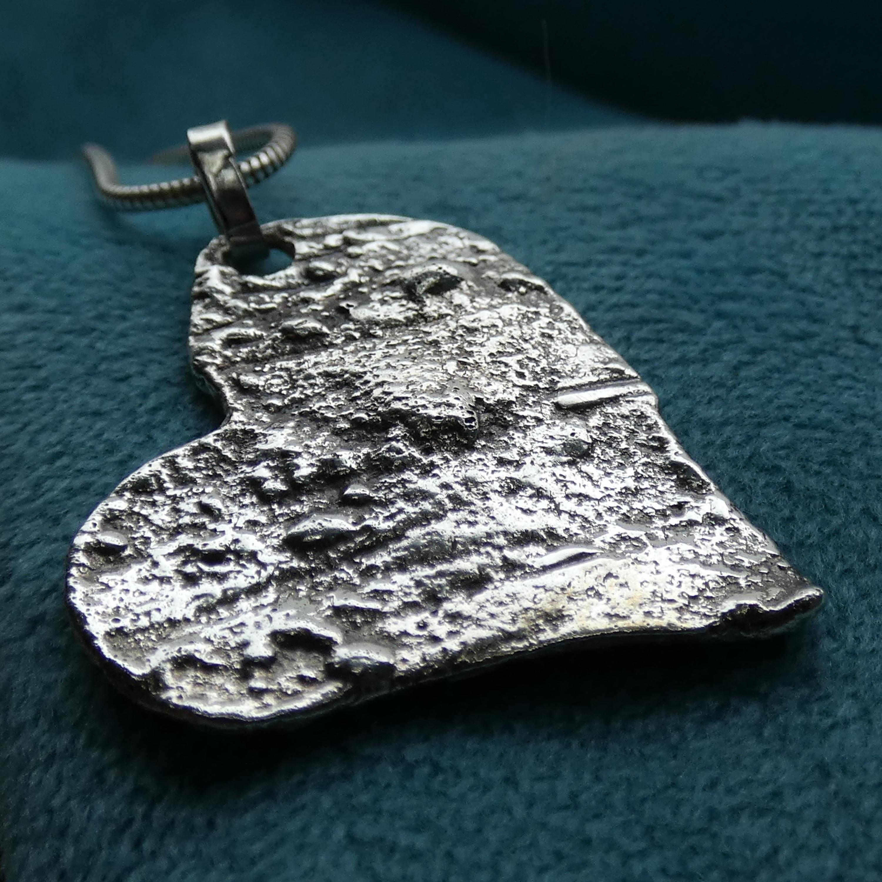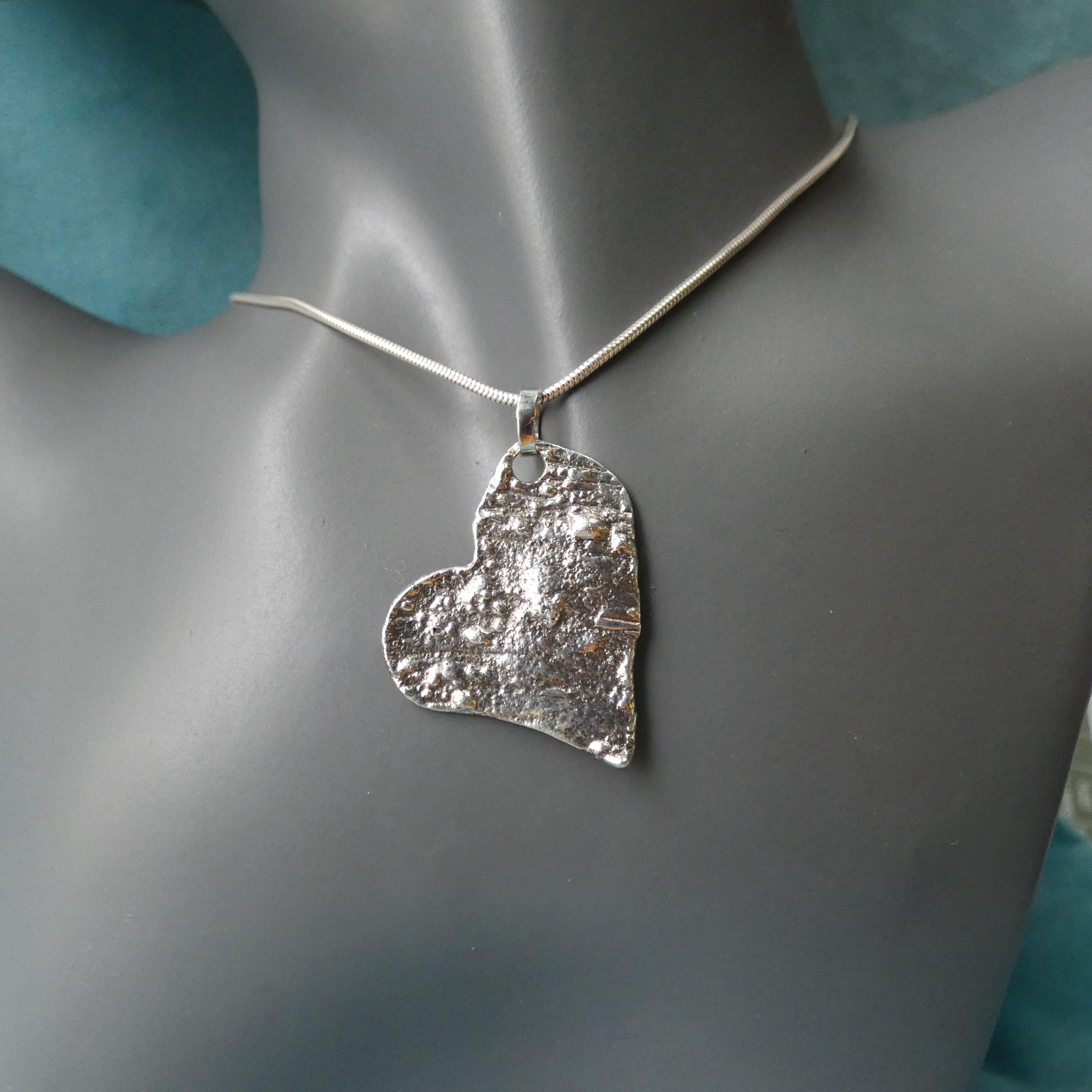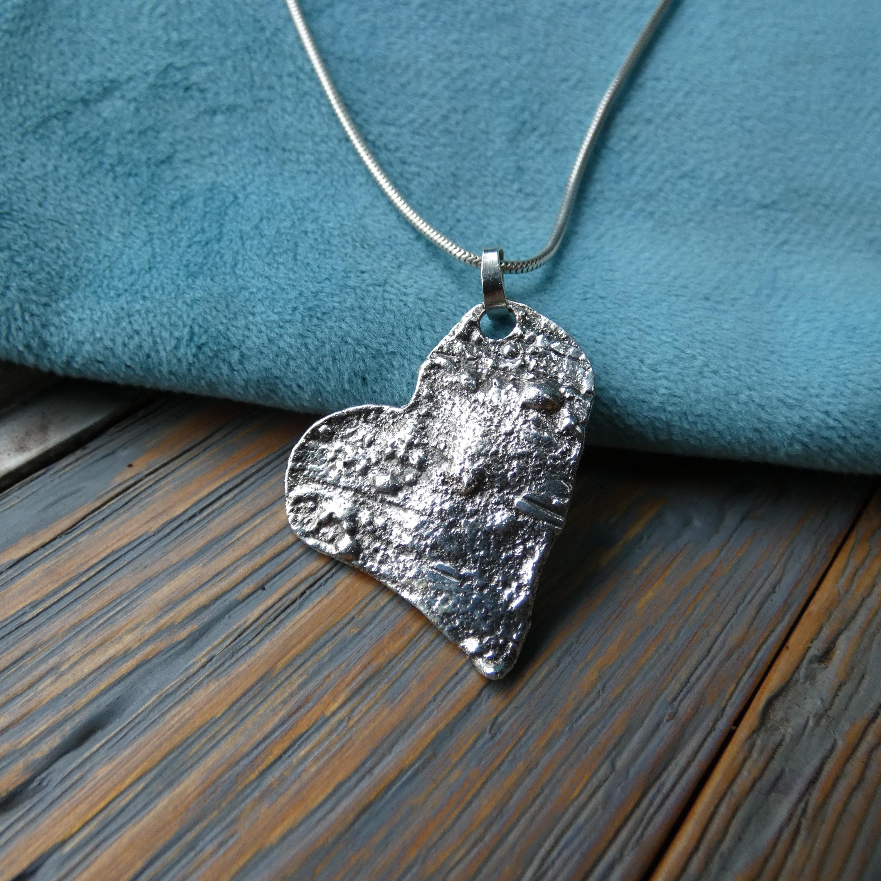 This 4.2 grams solid silver, heart shaped pendant is a one of a kind and handcrafted from molten silver. It is slightly tarnished to enhance its heavy textured surface.