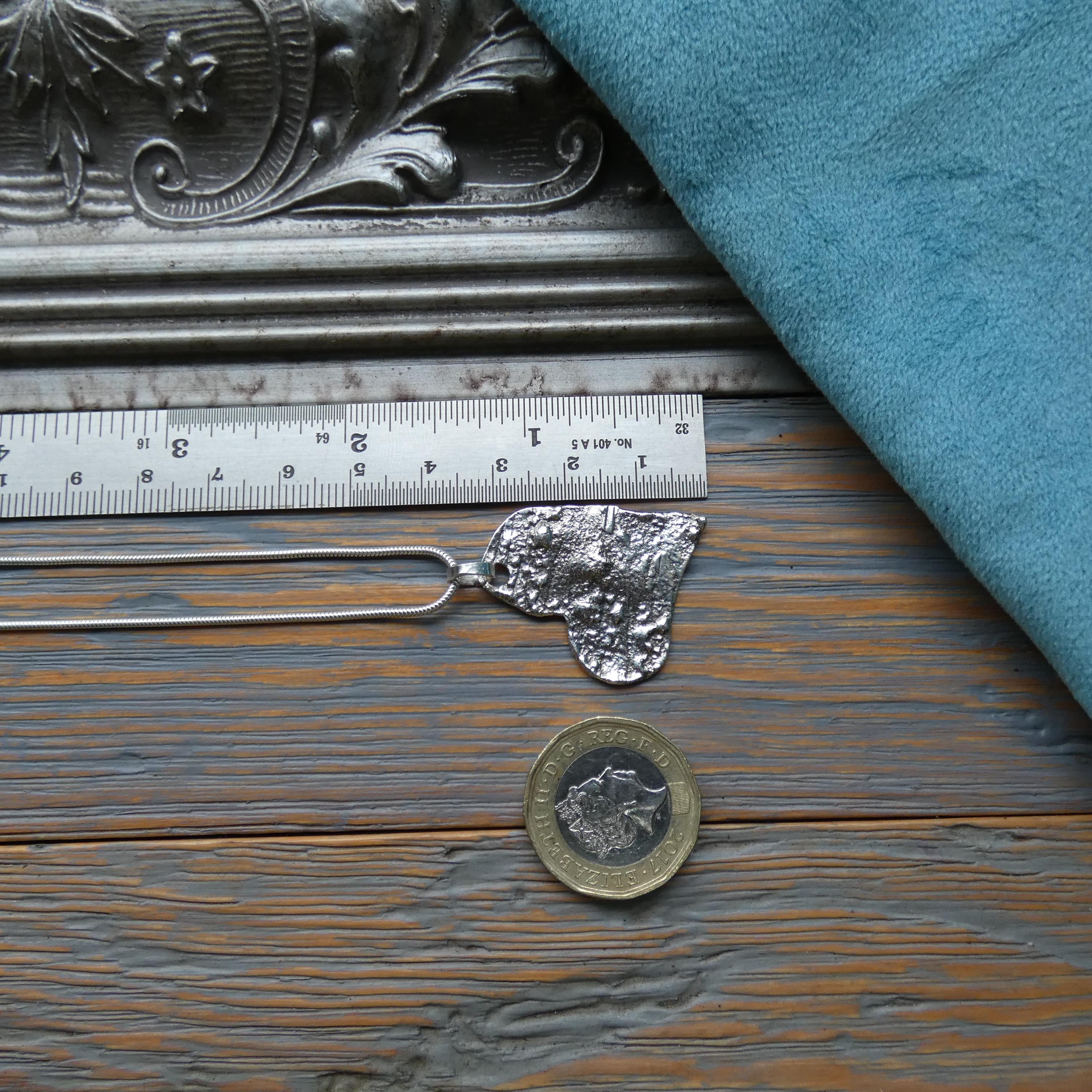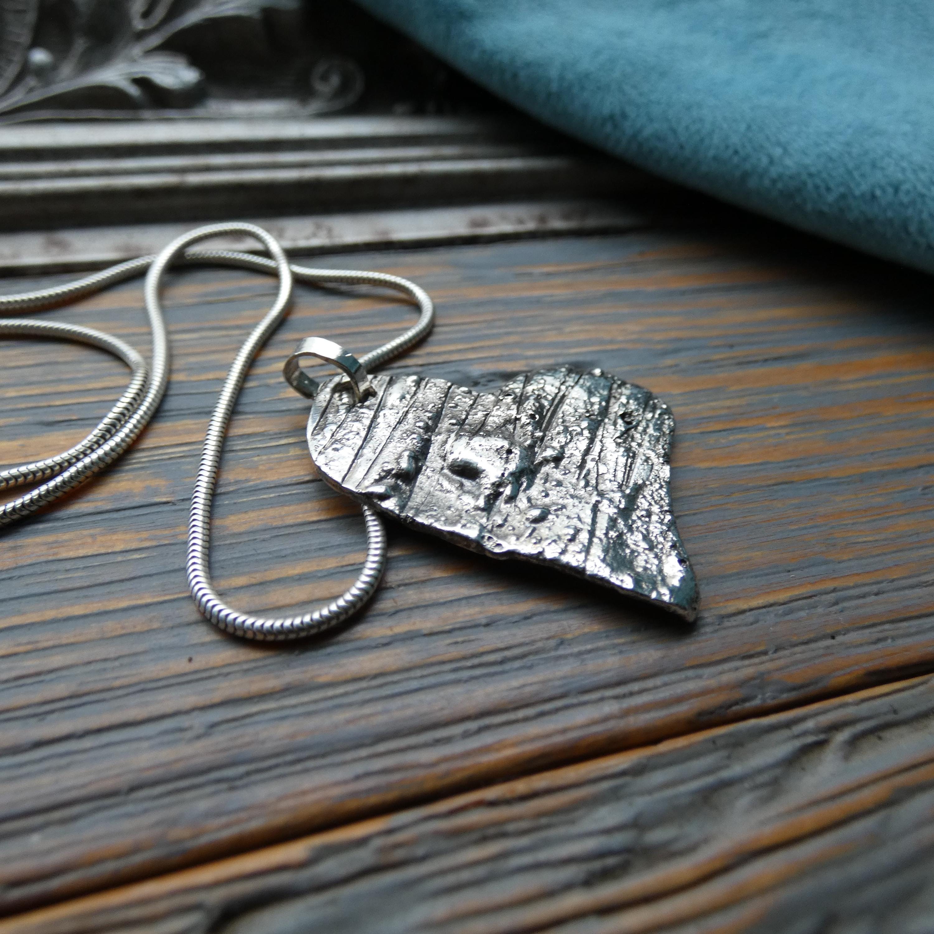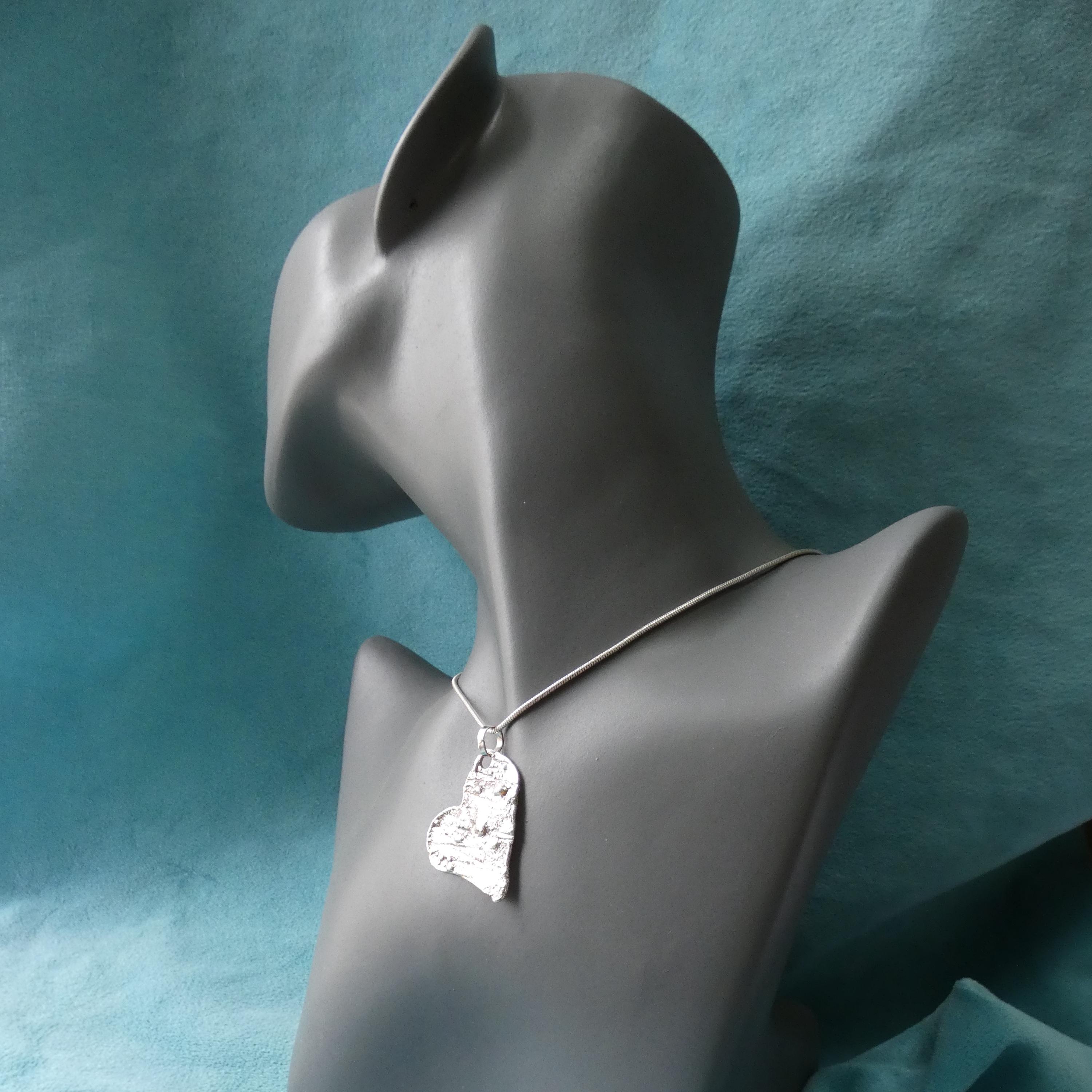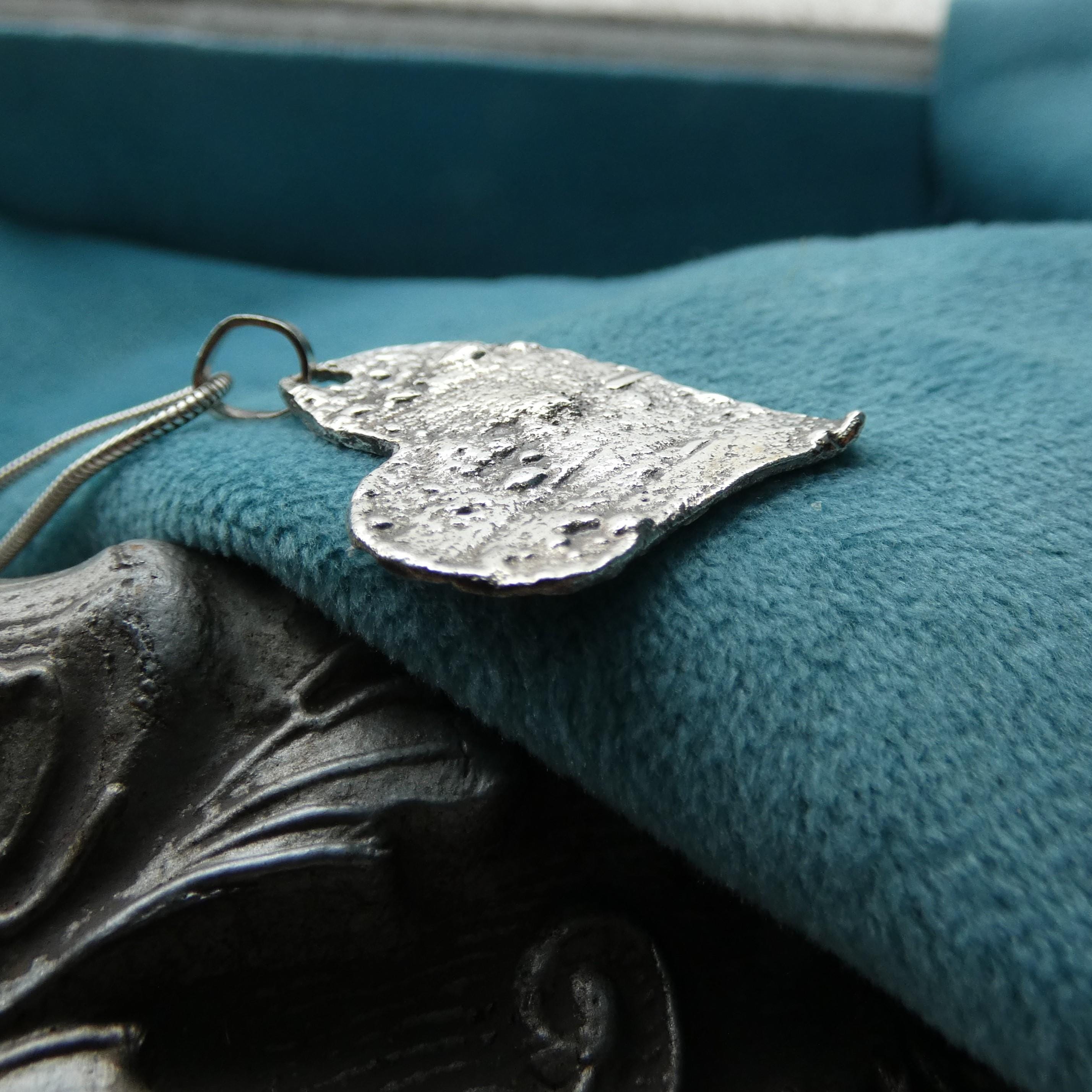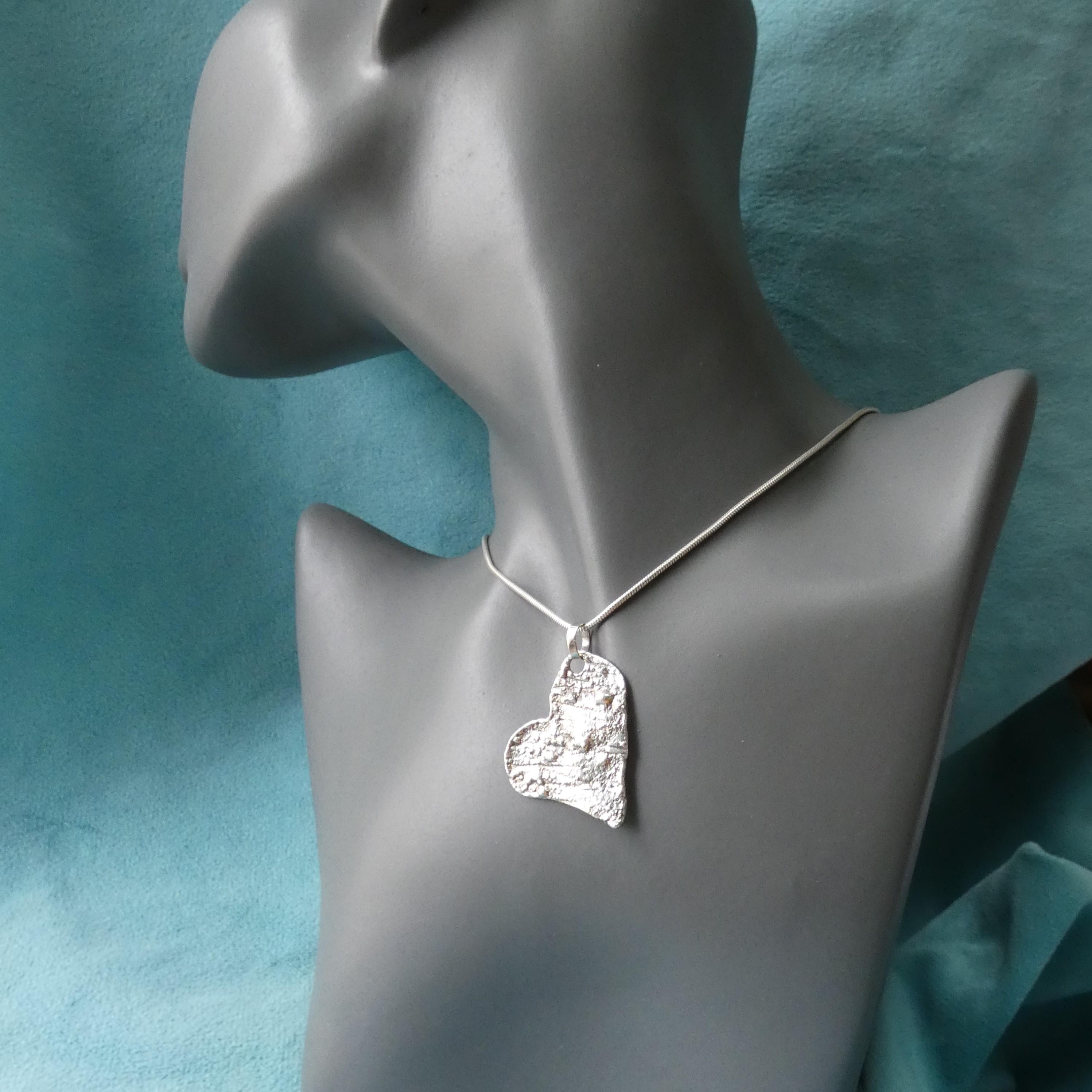This 4.2 grams solid silver, heart shaped pendant is a one of a kind and handcrafted from molten silver. It is slightly tarnished to enhance its heavy textured surface.