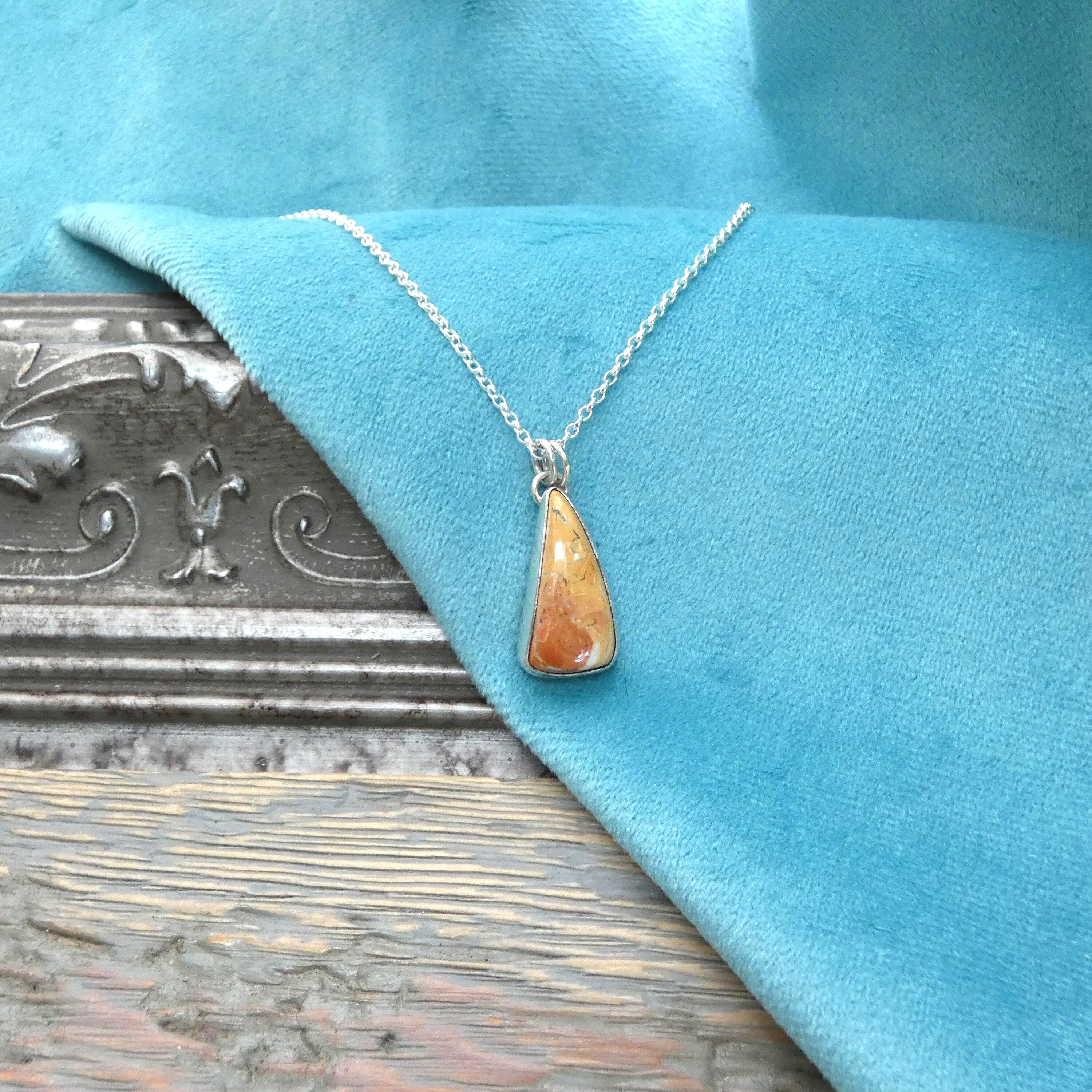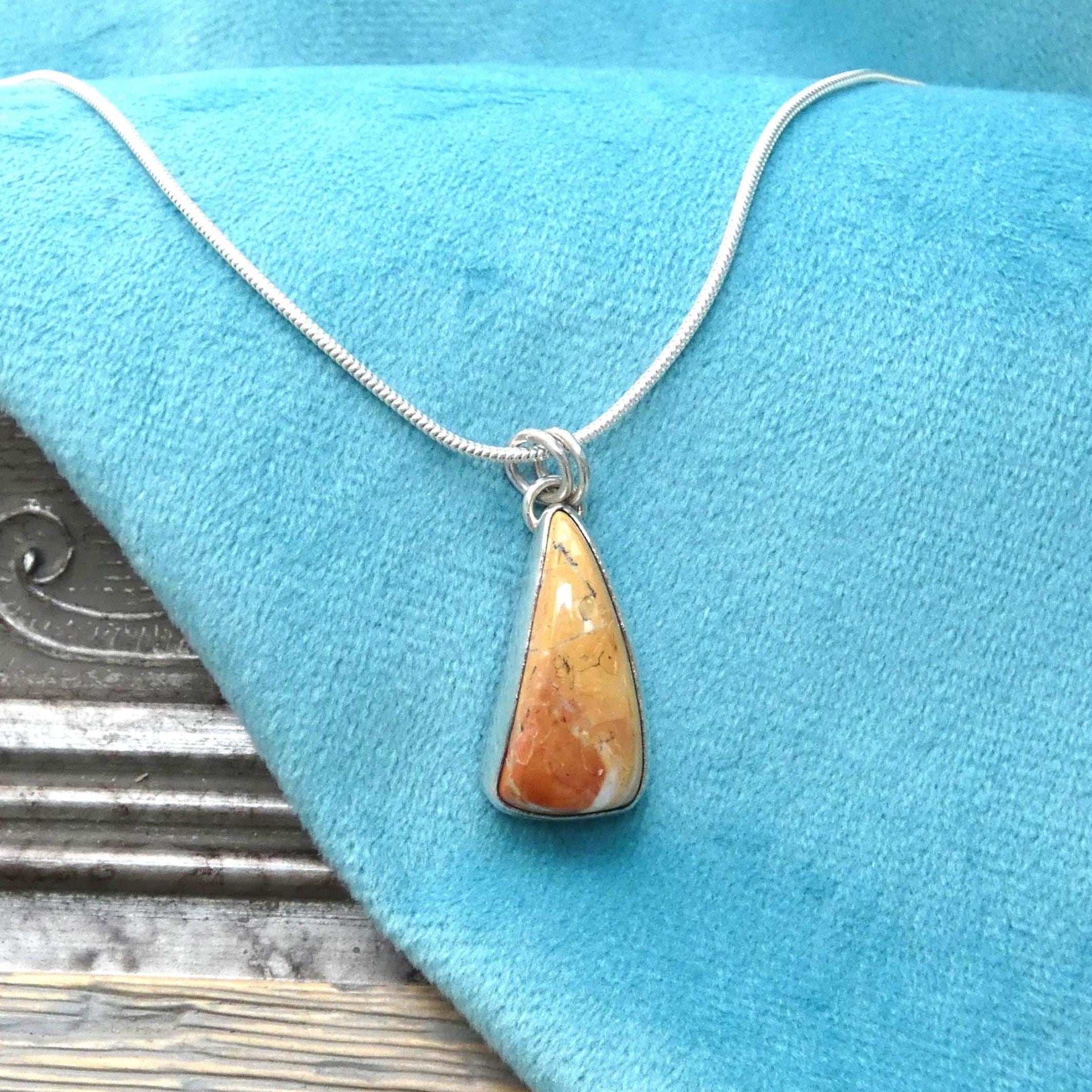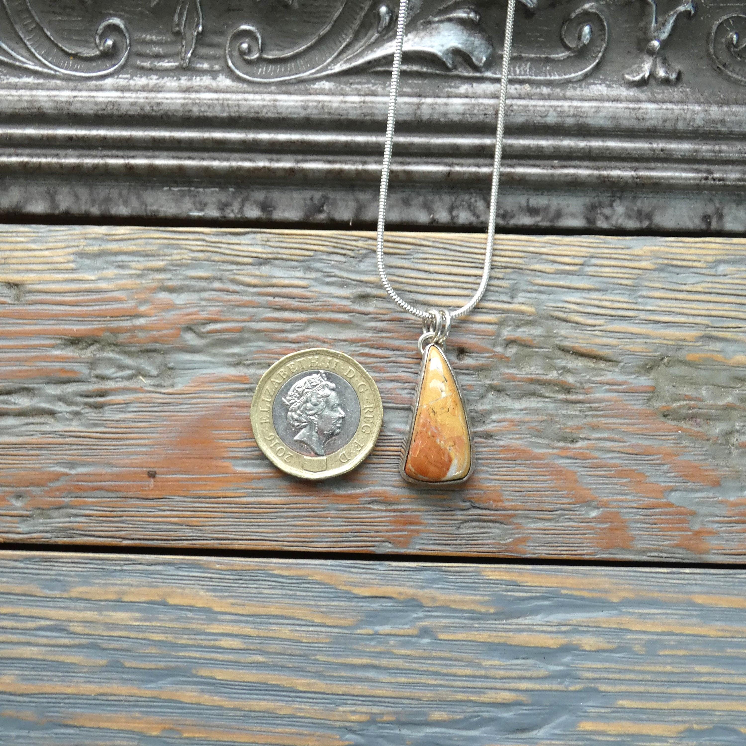 This lovely Picture Jasper stone has a mix of mustard yellows, oranges and a touch of white. Its natural look is simple but stunning. The pendant is handmade from sterling silver with a closed back.