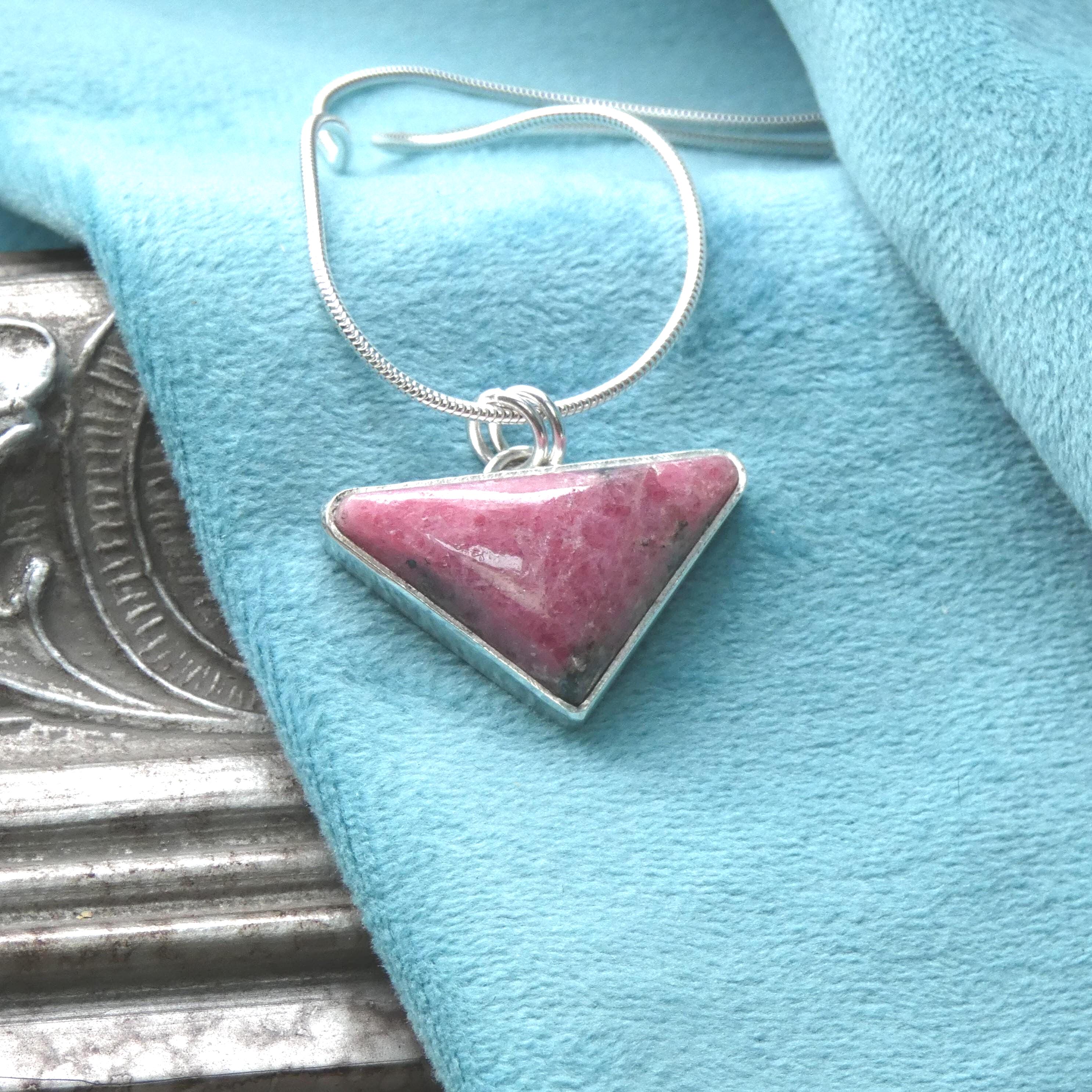This simple but unique pendant necklace is handmade using sterling silver. The stone is a natural pink Rhodonite gemstone with naturally occuring black traces. It is set in a classic bezel setting. This women's necklace is perfect to complete your everyday, casual outfit or wear it on special occassions.