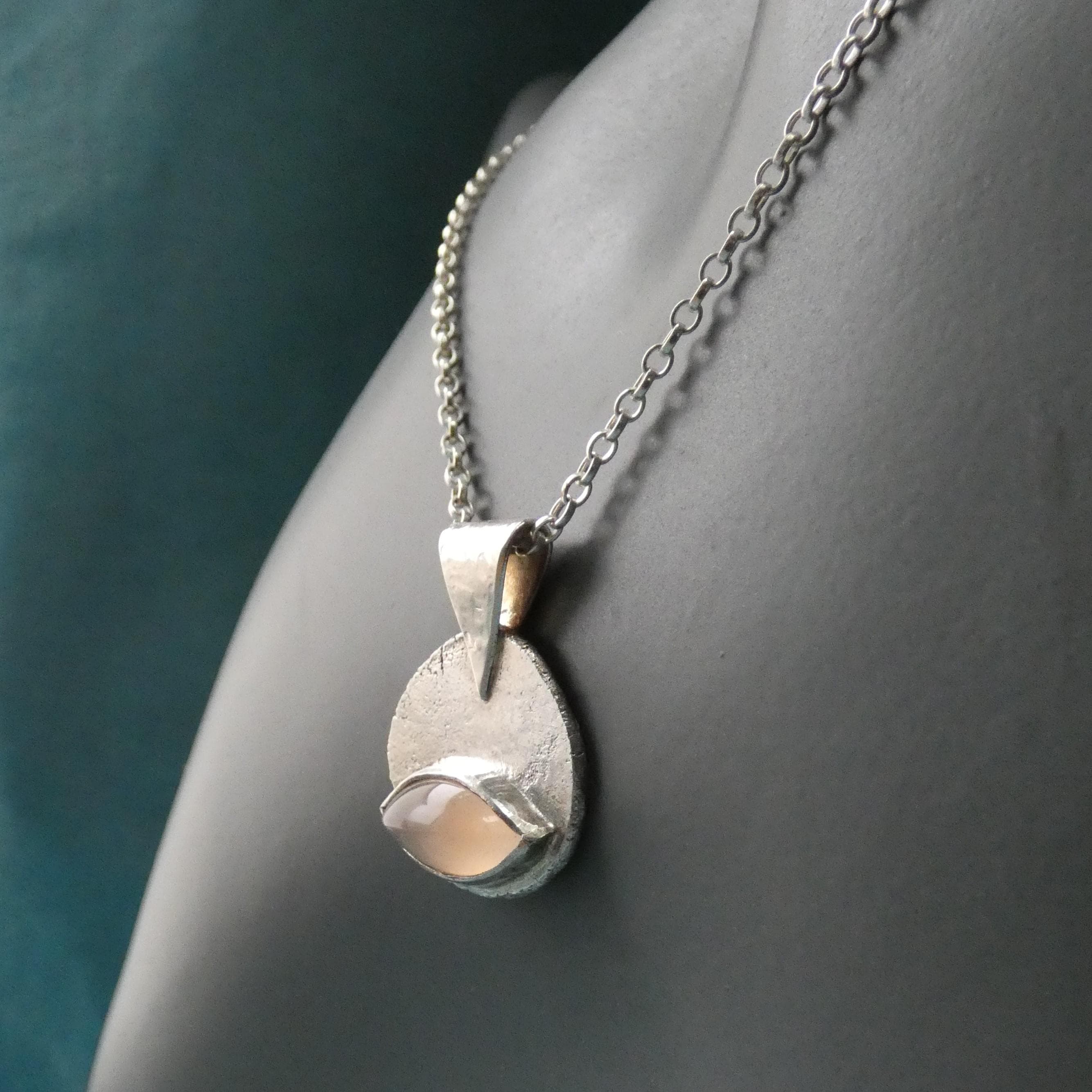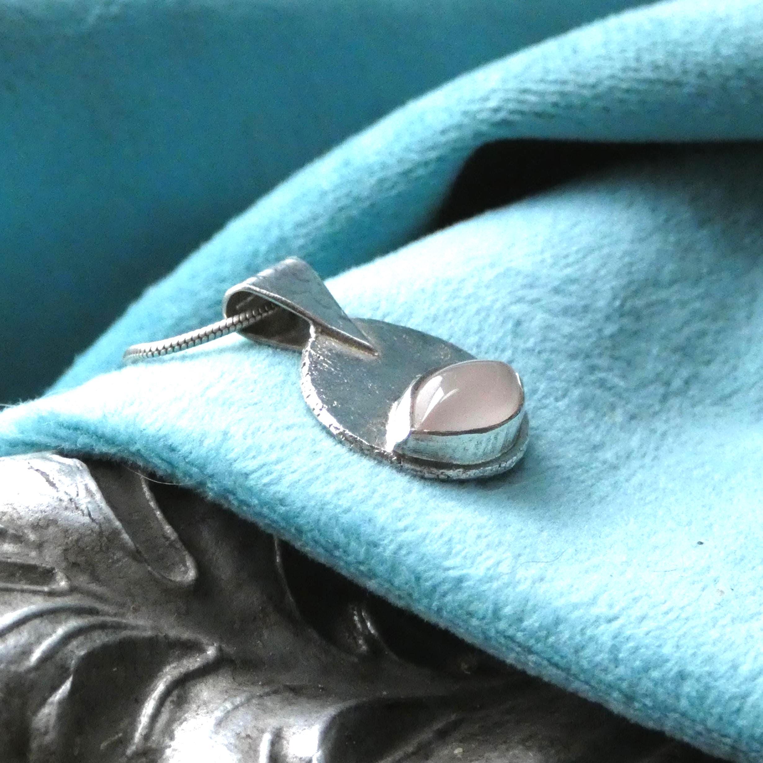 This unusual, primitive style pendant is handcrafted from sterling silver. The stone is a gorgeous marquise shaped pink chalcedony gemstone. The backplate has a rustic, slightly hammered texture which beautifully reflects the light back.