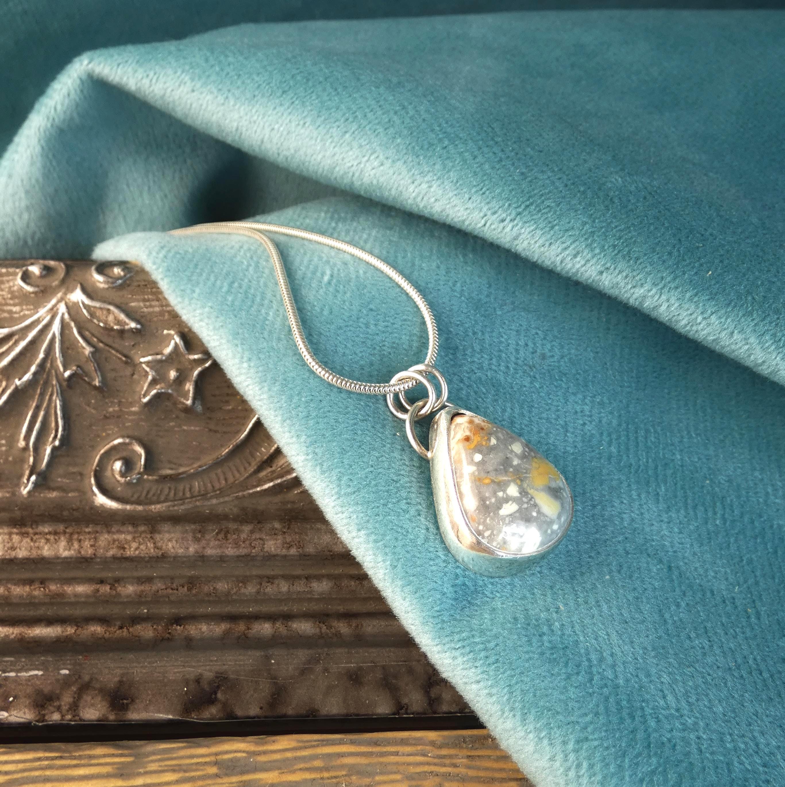 This lovely teardrop shaped Maligano Jasper stone has a range of greys and yellows. It is set in a classic bezel setting in sterling silver.