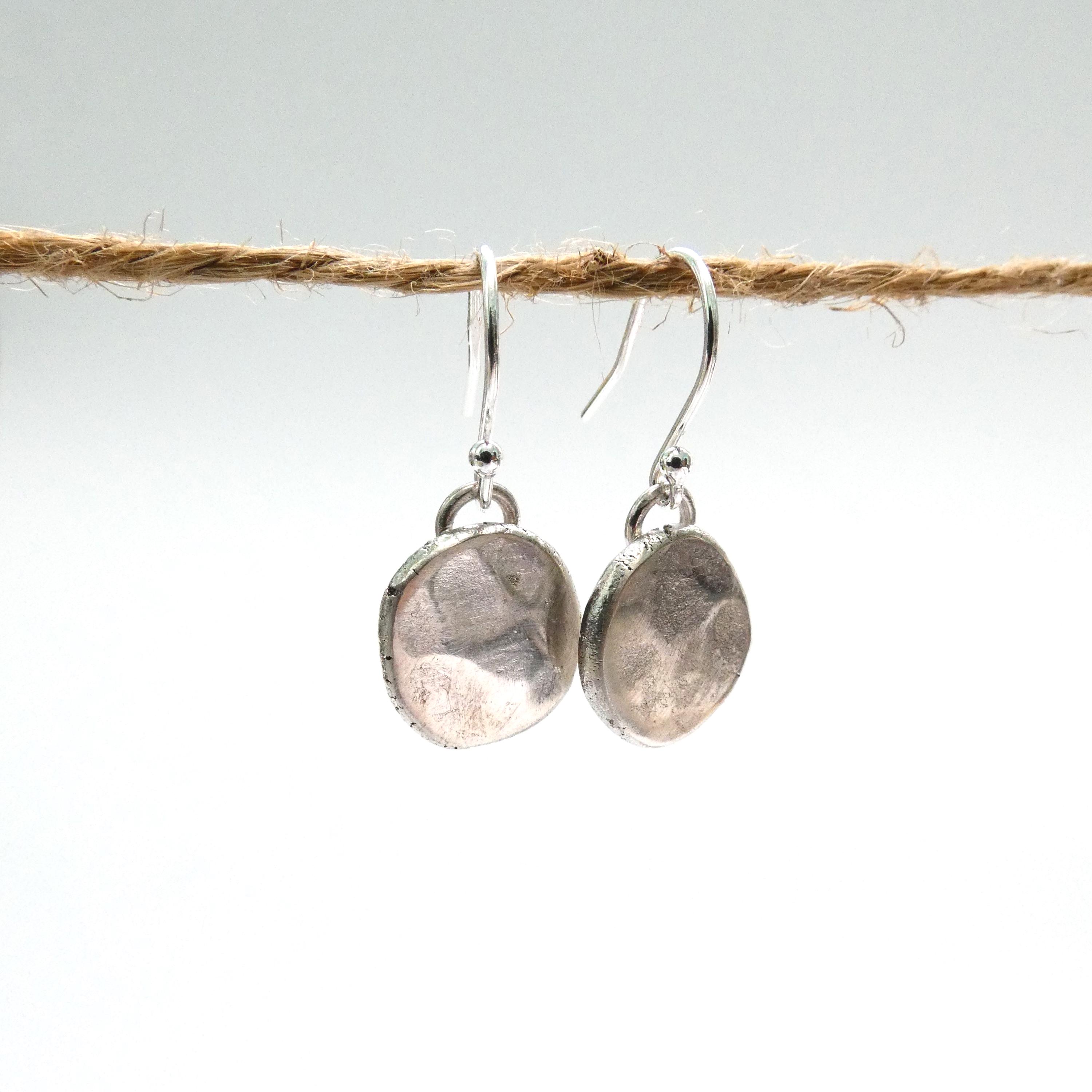 This unusual, organic shaped drop earrings are handcrafted from sterling silver. Their slightly textured, hammered surface beutifully reflects the light. Matching necklace is available.