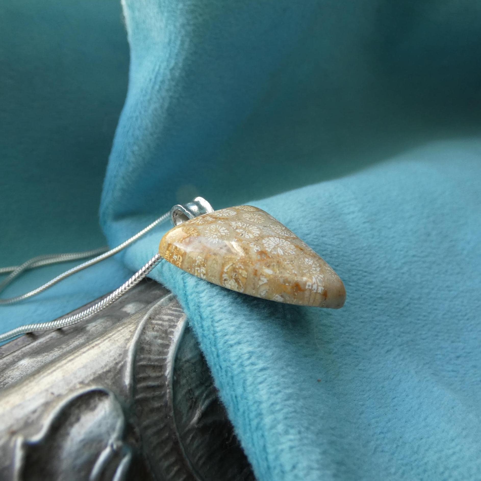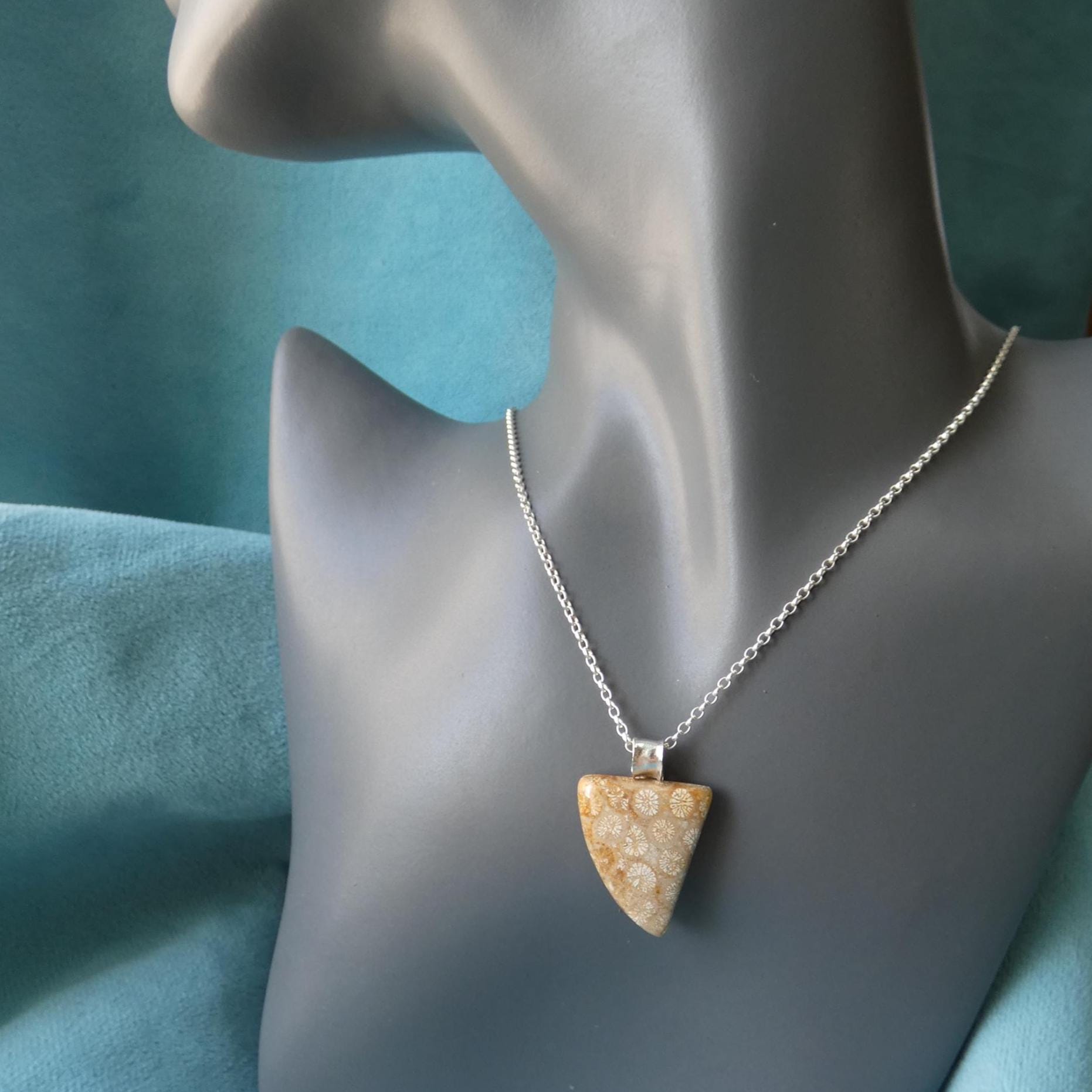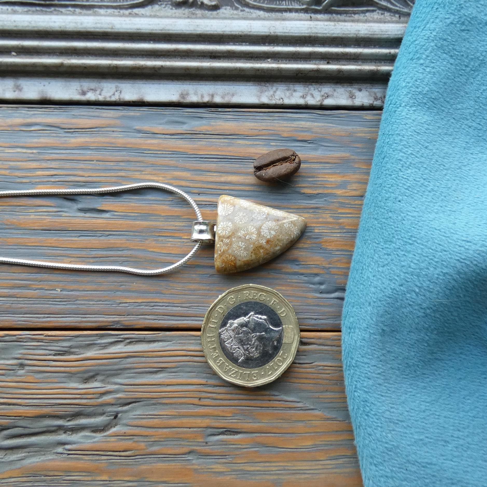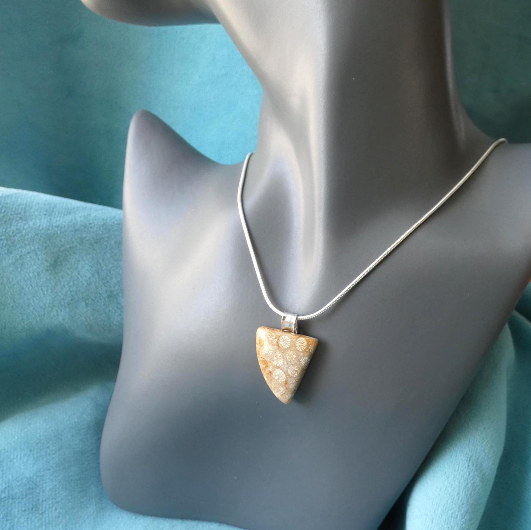 This beautiful large triangle shaped coral fossil stone is set in sterling silver.